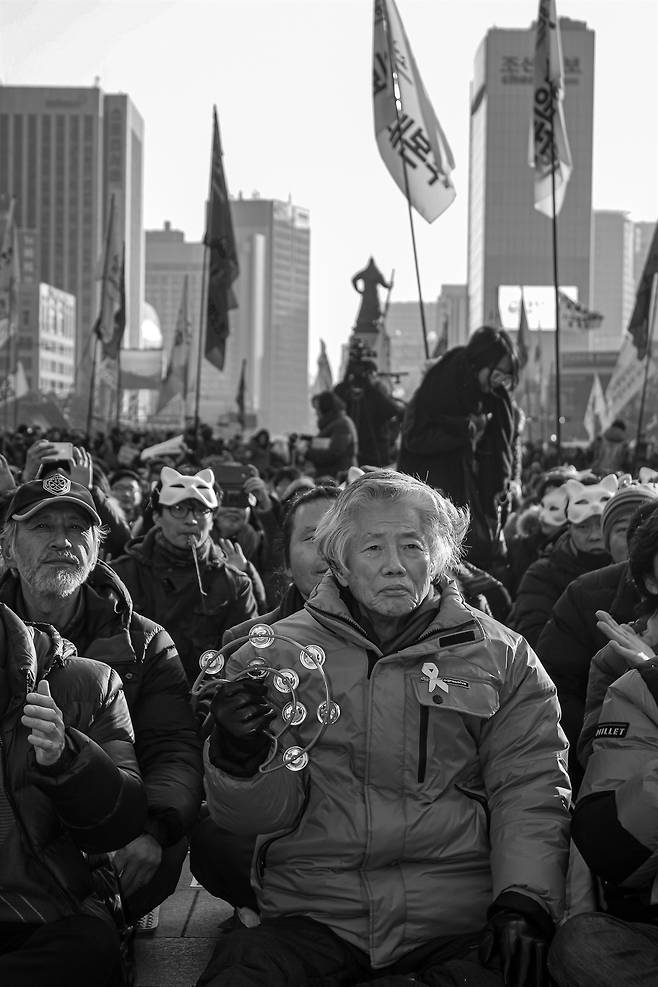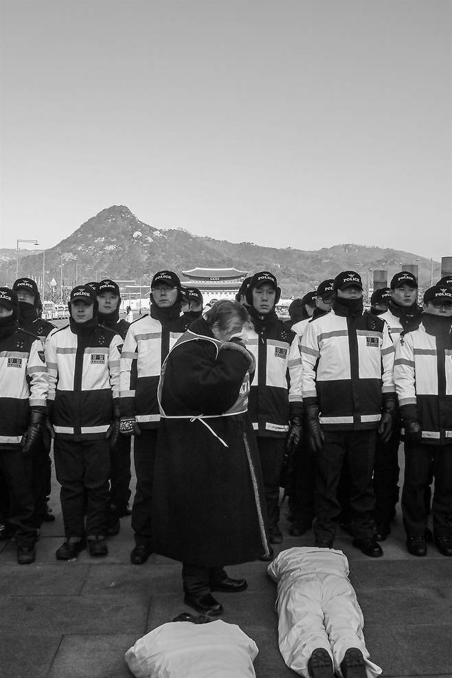 ▲ 차가운 거리에서 마주한 대치의 풍경. 백기완 선생이 평생 서 있었던 ‘권력과 인간 사이의 경계선’을 상징하는 순간(2014. 12. 광화문 광장). ⓒ 정남준