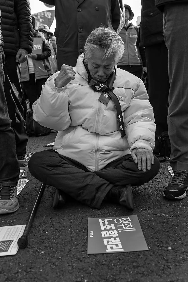 대표사진 속 장면 역시 그런 순간 중 하나다. 차가운 겨울 바닥에 엎드린 '비정규직 철폐'를 위한 오체투지 대열, 굳게 선 경찰들, 그리고 그 앞에서 허리를 숙여 눈물을 흘리는 백기완 선생의 모습. 이 장면은 특정 사건을 넘어 이 사회가 반복해 온 대치의 구조를 상징한다. 힘의 질서 앞에 서 있는 인간의 연약함, 그리고 그럼에도 불구하고 멈추지 않는 저항의 몸짓. 백기완 선생은 늘 그 경계선 위에 서 있었다.