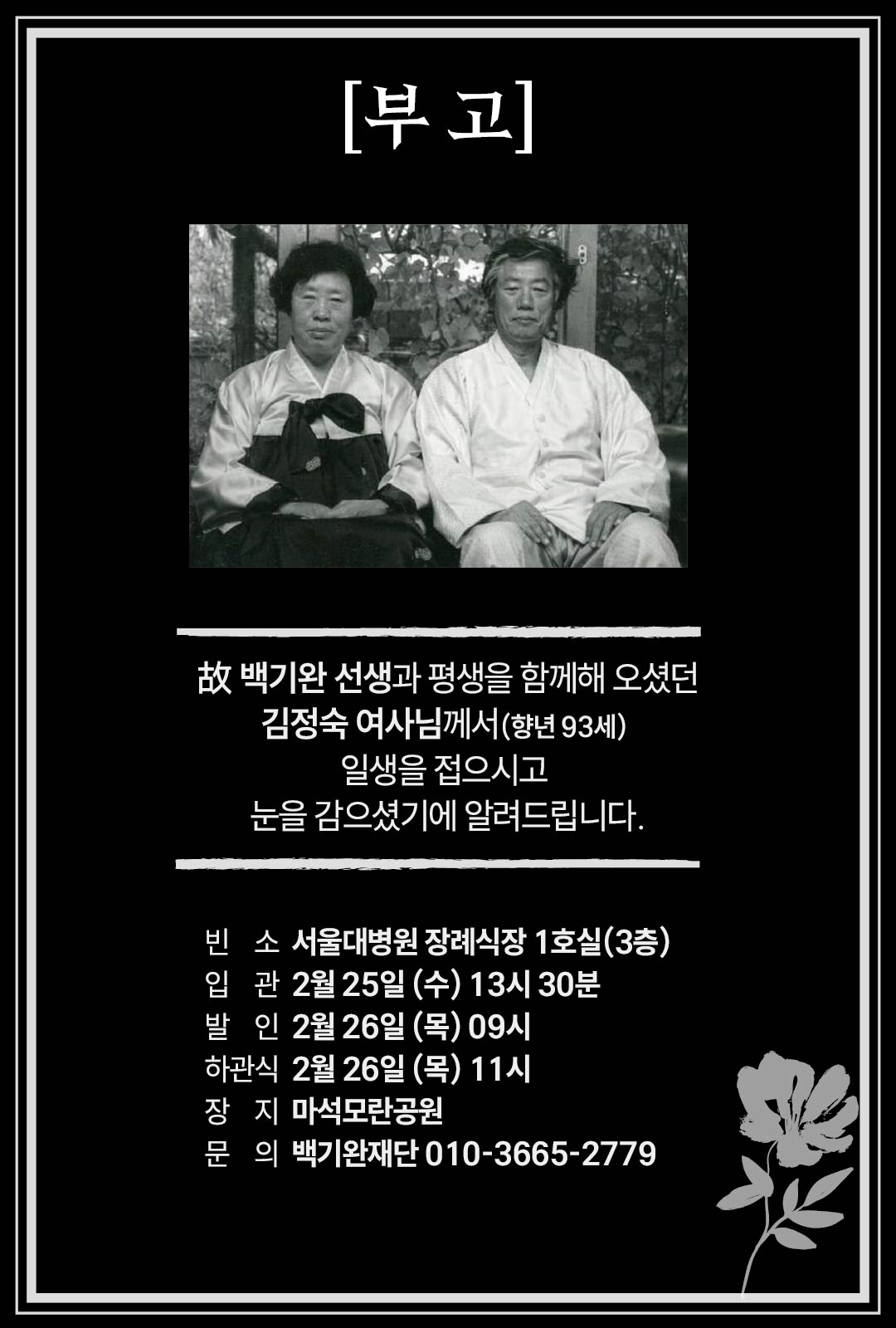 고 백기완 선생과 평생을 함께해 오셨던 김정숙 여사님께서(향년 93세) 일생을 접으시고 눈을 감으셨기에 알려드립니다.