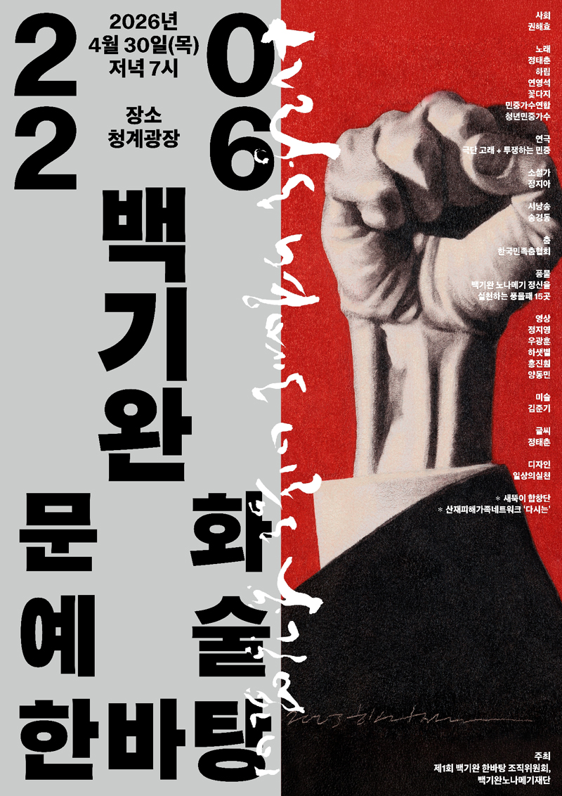 이번 행사는 음악·시·춤·연극·영상·미술이 결합된 참여형 예술제로, 사회는 배우 권해효가 맡는다. ‘ 백기완 문화예술 한바탕 추진위원회’는 “과거를 기념하는 데 그치지 않고, 오늘의 차별과 배제 속에 놓인 이들과 함께하는 새로운 문화 실천의 시작”이라고 이번 행사의 의미를 설명했다.